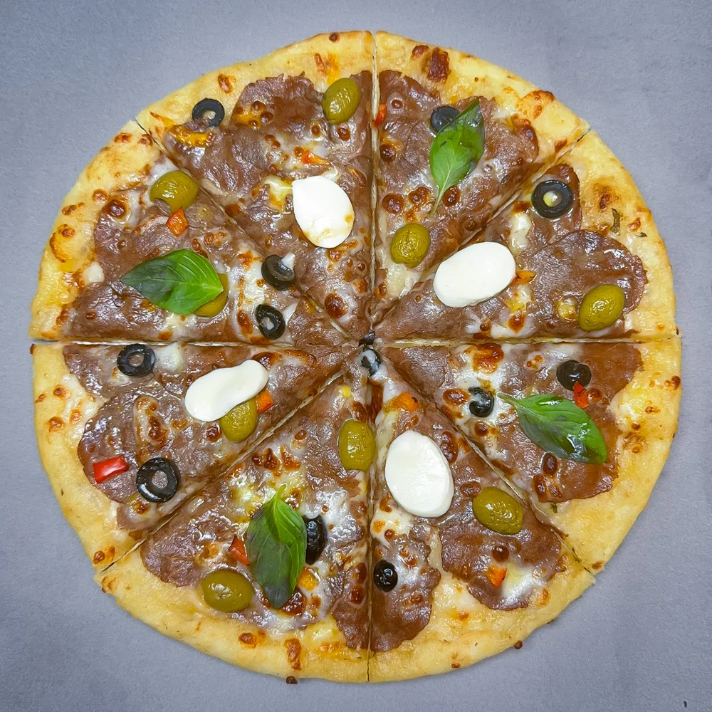 خمیر مخصوص باسیکا، فیله گوساله مرینیت شده، پنیر موزارلا تازه، زیتون سبز، زیتون سیاه، فلفل دلمه رنگی