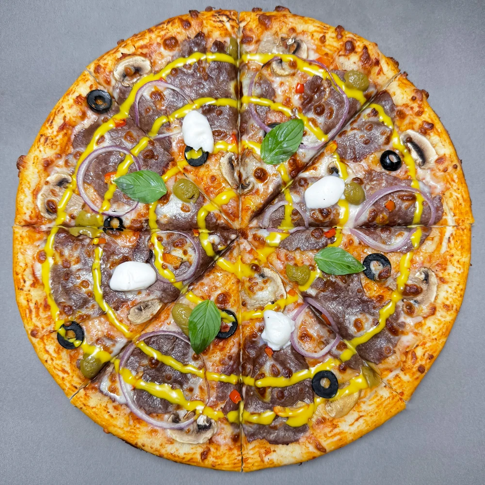 خمیر مخصوص باسیکا، گوشت رست بیف مرینیت شده، گوشت کنجه ای، سس سیر، پیاز کاراملایز، پنیر موزارلا تازه، زیتون سیاه، سس خردل