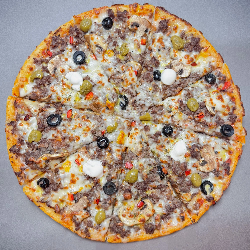 خمیر مخصوص باسیکا، گوشت گوساله چرخ شده، پپرونی 90 درصد گوشت، فلفل هالوپینو، سس تند، زیتون سیاه، فلفل دلمه رنگی