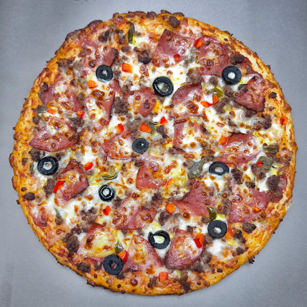 خمیر مخصوص باسیکا، پپرونی 90 درصد گوشت، زیتون سبز، زیتون سیاه، فلفل هالوپینو، فلفل دلمه رنگی
