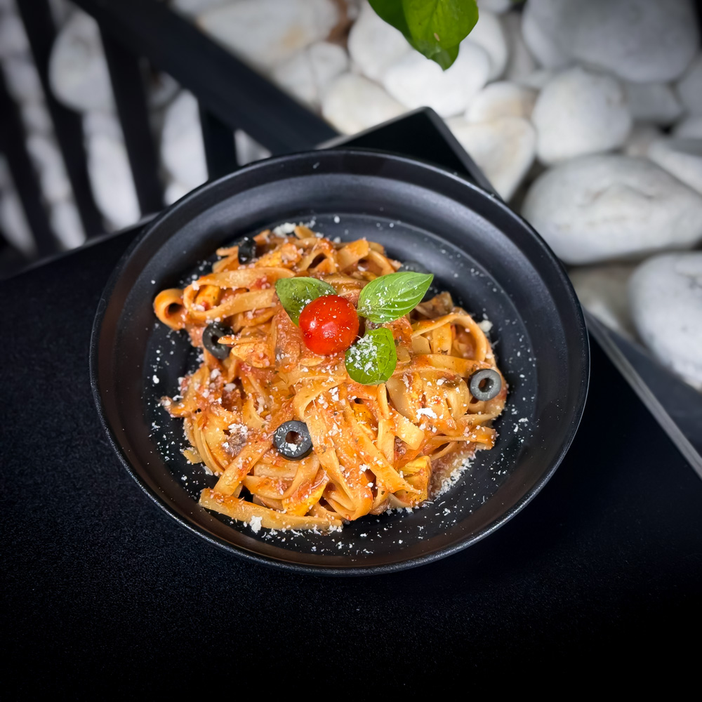 پاستا فتوچینی، فیله مرغ، سس پستو مخصوص باسیکا، قارچ بلانچ، زیتون سیاه